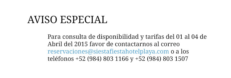 Siesta Fiesta Hotel está situado en el corazón del increíble centro de la ciudad de Playa del Carmen. El hotel en sí, es un ícono en Playa del Carmen, ya que tiene más de 20 años en la famosa "5a Avenida". El Hotel cuenta con diversas comodidades y opciones para relajarse además de tener una ubicación perfecta para el viajero relajado búsqueda de distracción y diversión.